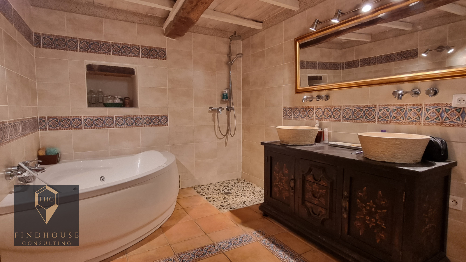 Le salon/séjour bénéficie d'une jolie vue avec terrasse et son jacuzzi et d'un volume en cathédrale avec mezzanine et accès aux combles isolés et aménageables.