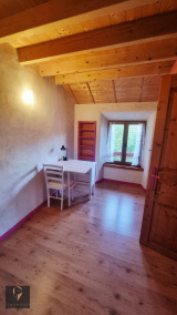 Edifiée sur 2 niveaux et mitoyenne sur un côté, cette maison pleine de charme comprend une cuisine équipée ouverte sur salon/séjour avec un beau poêle à bois Godin, un cellier, 2 chambres, l'une comprenant une pièce dressing, une salle d'eau avec douche et wc.
