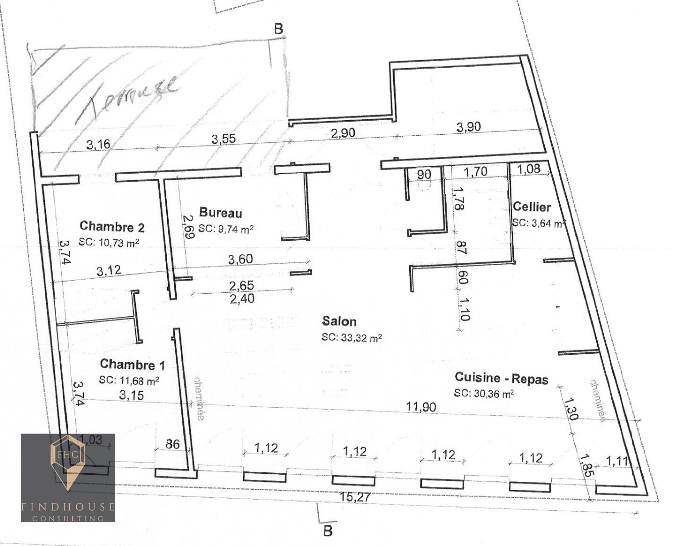 Au 1er niveau, un appartement T4 avec terrasse et balcon d'une surface de 98 m2.
