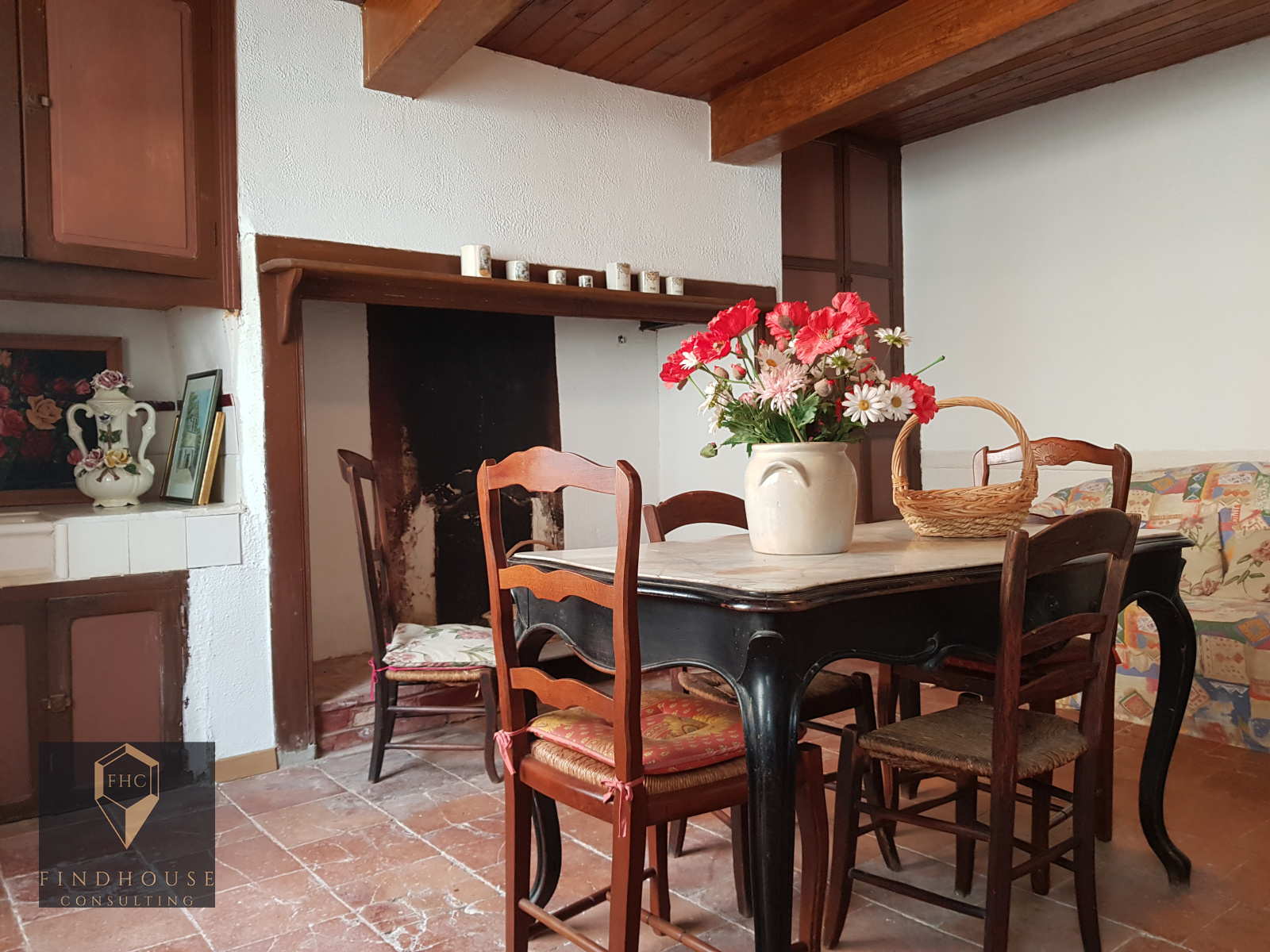 Composée d'une part au RDC, d'une cuisine accompagnée d'une grande cheminée, d'un salon tv et d'une jolie salle à manger avec grande cheminée (tomettes et poutres apparentes), une salle d'eau et wc indépendant.