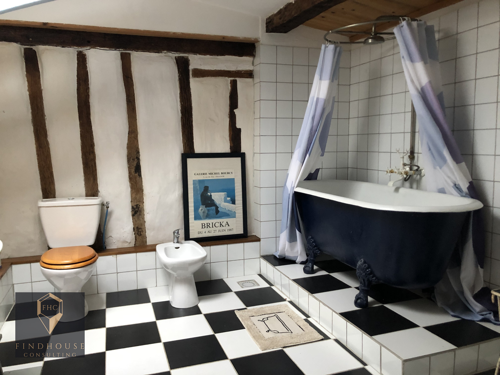 La maison principale comprend un hall d'entrée avec escalier et tomettes au sol, une grande pièce de vie d'une surface de 58 m² qui offre un accès direct à la terrasse, une cuisine séparée et équipée, une chambre ou bureau (28 m²), une buanderie, une salle de bain avec douche à l'italienne et baignoire et un WC indépendant.