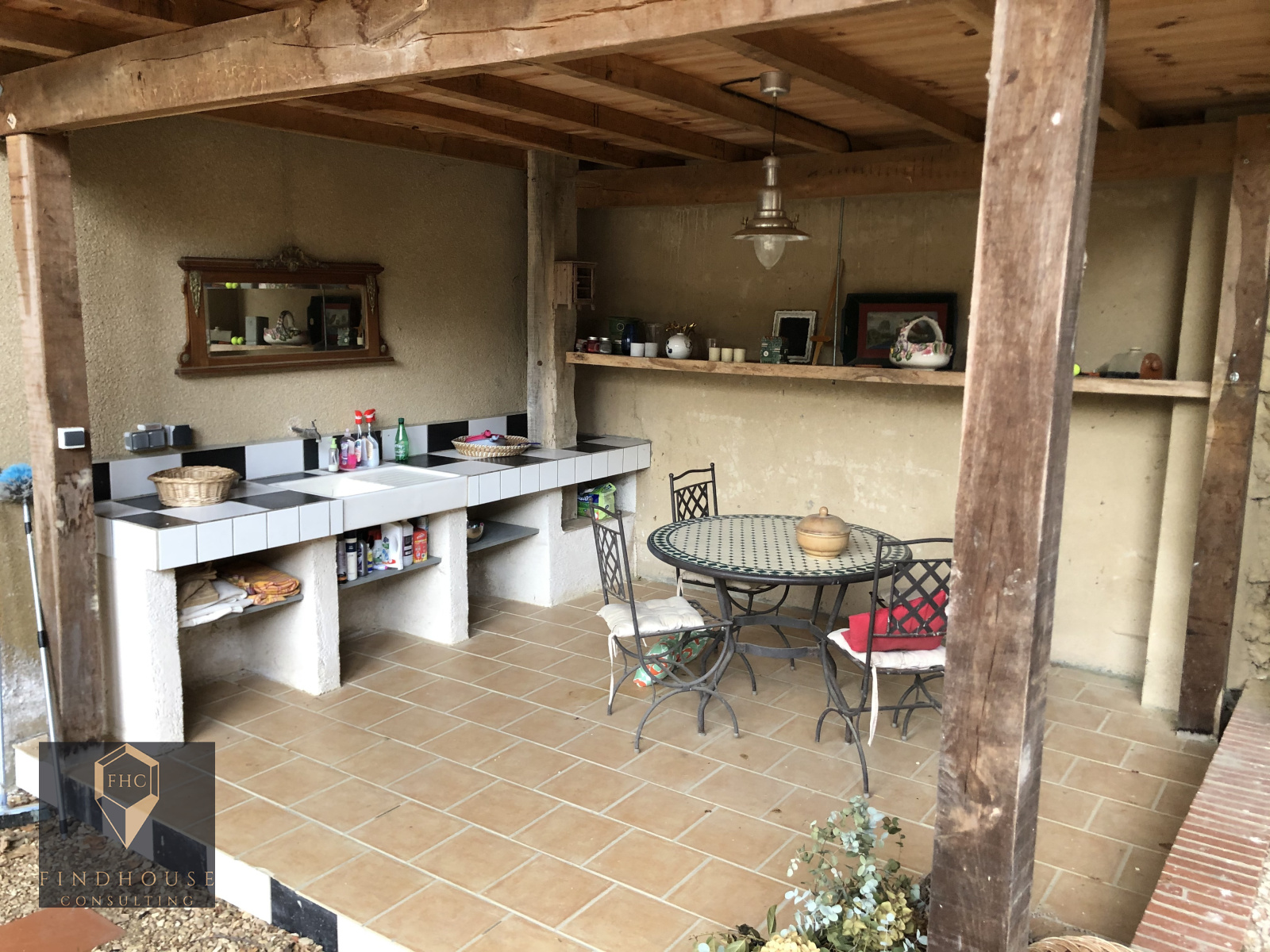 A l'éxterieur, vous découvrirez un joli parc agrémenté d'une mare, un puits, 2 car-ports, 140 m² au sol de dépendances, une cuisine d'été et une grande terrasse de 19 m² qui vous offre une vue imprenable sur la campagne et les Pyrénées.