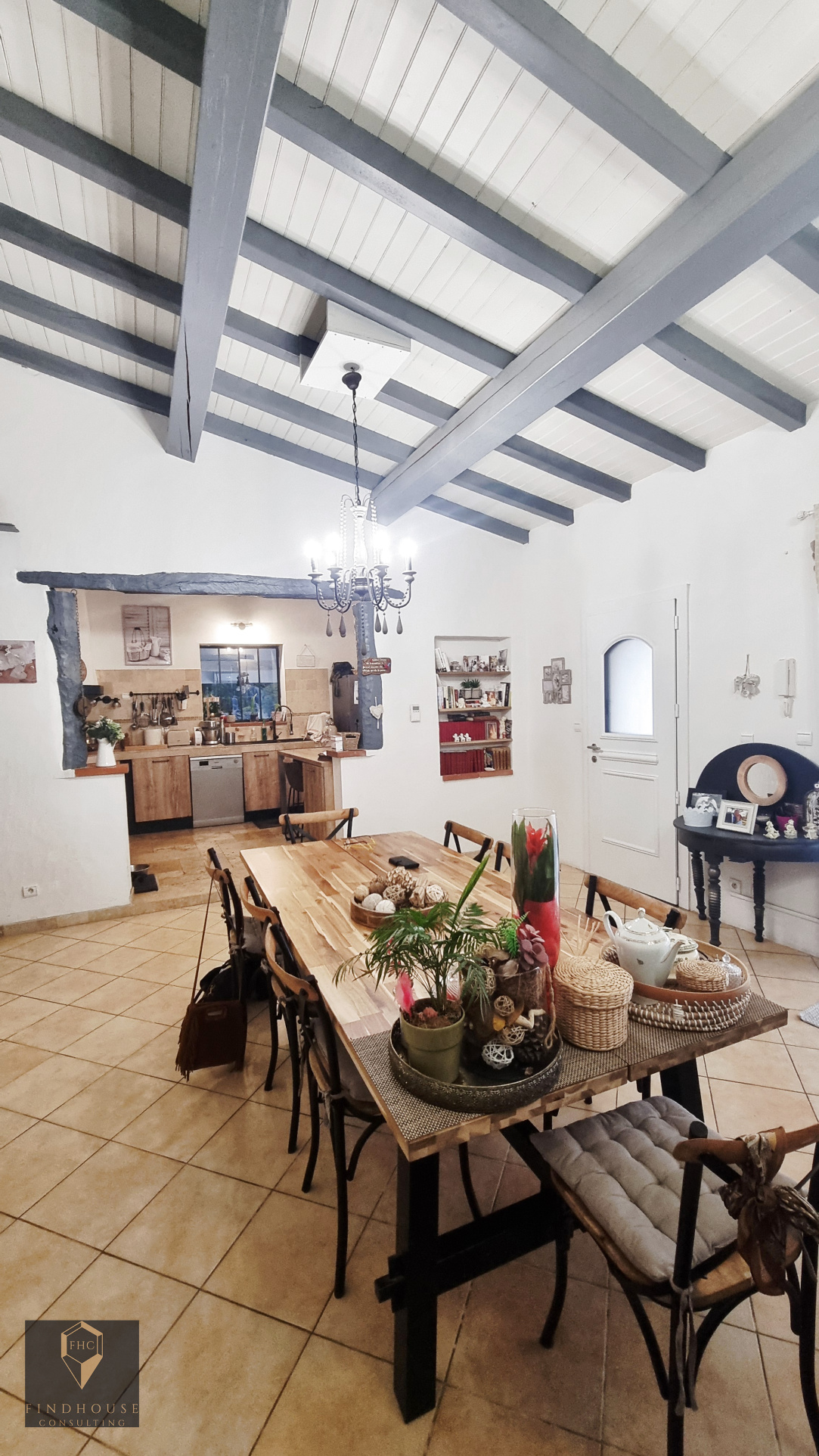 Equipements : isolation des murs par l'extérieur, poutres apparentes, beaux volumes. Menuiseries double vitrage. Portail ouvrant électrique. Système de chauffage cheminée au bois + clim réversible. Production eau chaude thermodynamique, panneaux photovoltaïques. Assainissement autonome micro-station. Double carport. Piscine 8x4 (liner / sel) entourée d'une terrasse bois. Barbecue.