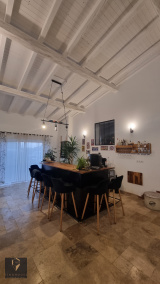 Orientée Est/Ouest, cette villa entièrement rénovée comprend une entrée sur cuisine us ouverte sur salon d'une surface de 42 m² avec un accès à la terrasse. Elle se prolonge d'un vaste séjour en cathédrale et lumineux de 104 m² avec une grande cheminée et de grandes ouvertures permettant un accès direct au jardin et à la piscine.